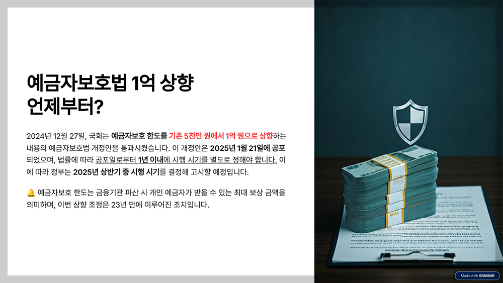 2024년 12월 27일, 국회는 예금자보호 한도를 기존 5천만 원에서 1억 원으로 상향하는 내용의 예금자보호법 개정안을 통과시켰습니다.