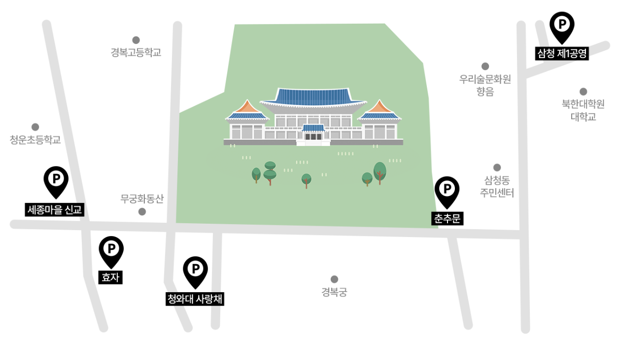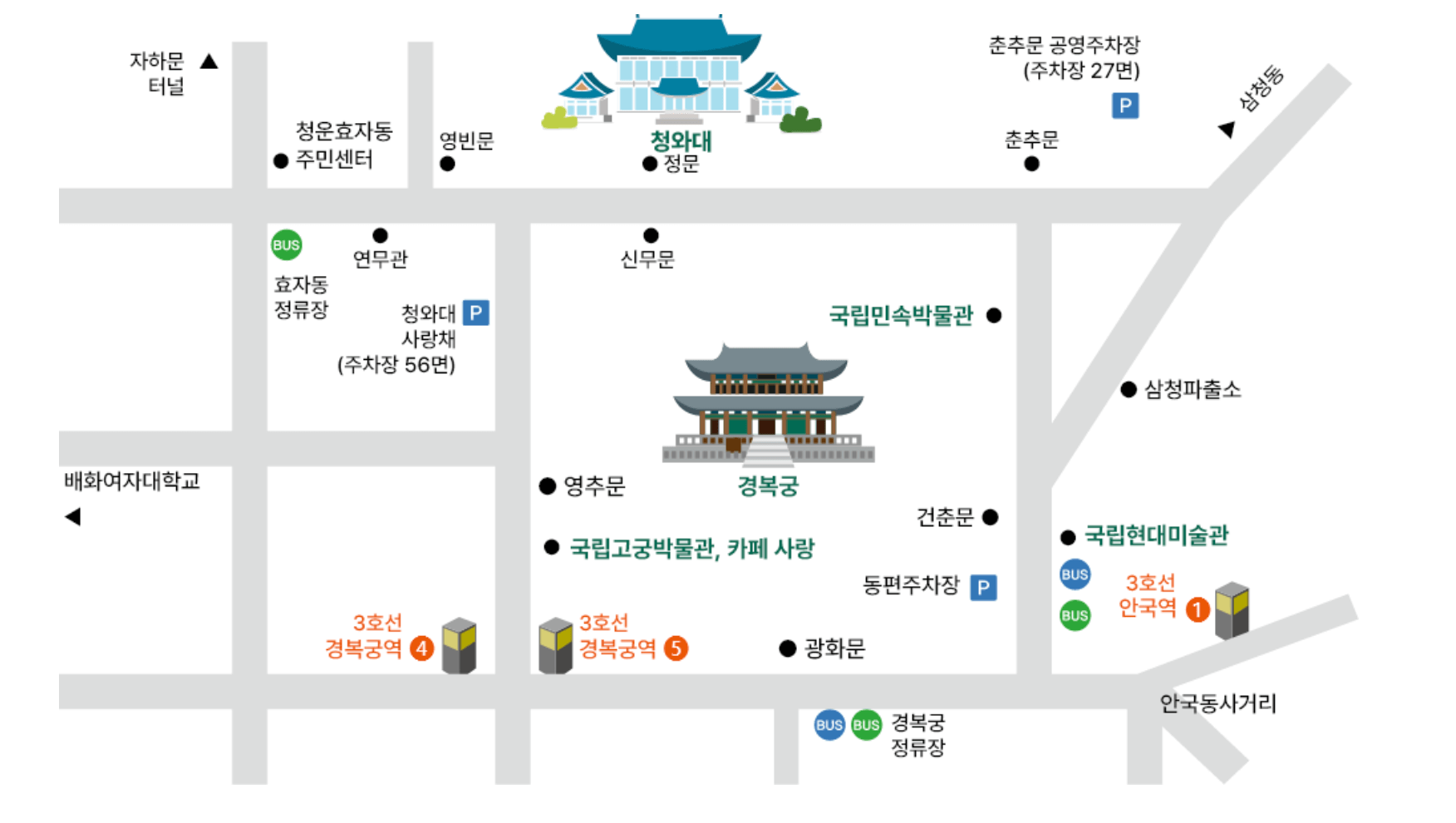 - 3호선 경복궁역 4번 출구로 나와 청와대까지 도보 15분 이동
