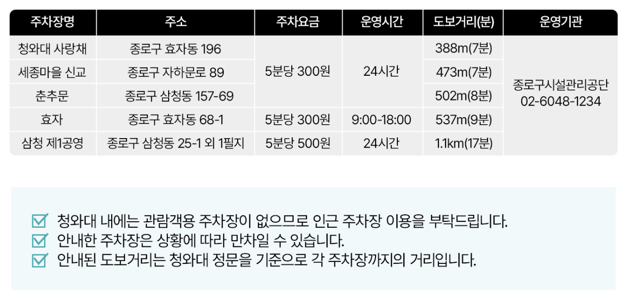 청와대 내에는 관람객용 주차 시설이 없으니, 가급적 대중교통을 이용하시기 바라며, 승용차를 이용하시는 경우에는 청와대 사랑채 주차장(56면)과 인근 공영주차장을 이용하시기 바랍니다.