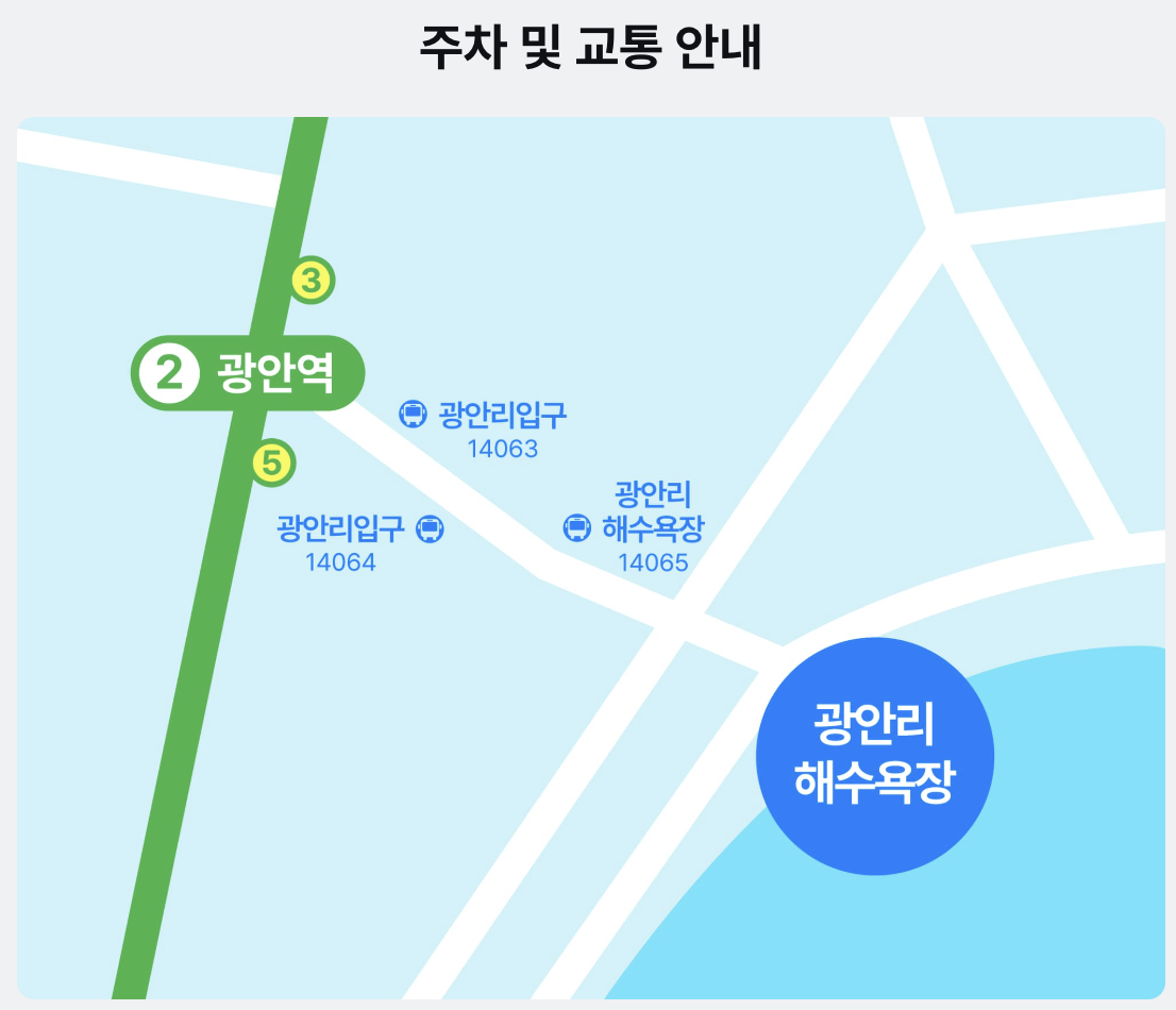 이벤트 장소까지 도보 약 5분 - 광안리해수욕장 동방시장 방면 (정류장코드: 14068)