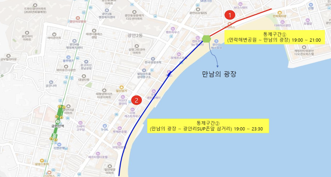 4️⃣ 교통통제: 19시~23:30 민락해변공원~만남의 광장 일대